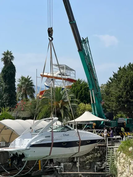 داخل حوضچه قرار دادن قایق کروز تفریحی در سواحل مازندران توسط جرثقیل سیامک لنگرنشین یکی از شرکت‌های کرایه جرثقیل در